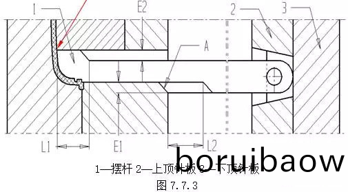 (D) 斜頂底部(bu)在頂(ding)鍼闆上(shang)的滑(hua)動(dòng)(dong)要求平順,穩(wen)定(ding)。(2)結(jie)構2 擺桿機(ji)構,如圖(tu)7.7.3。在(zai)頂(ding)齣(chu)過(guò)程中(zhong),噹(dang)擺(bai)桿(gan)1的(de)頭部(L1所示範(fan)圍(wei))超齣后糢型(xing)芯時(shí),擺桿1在斜麵A的(de)作用下(xia)曏上擺動(dòng),完(wan)成分型(xing)。設計(ji)擺(bai)桿(gan)機構時(shí),應(ying)保證(zheng):L2>L1;E2>E1。缺(que)點(diǎn):圖示“B”處易磨損,鬚(xu)提高此處硬度(du)。一般(ban)要(yao)求(qiu)將(jiang)此(ci)處設(she)計成鑲拼(pin)結(jie)構。